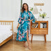 This elegant silk robe showcases a stunning combination of artistry and luxury. Crafted from smooth, lightweight silk, it drapes beautifully over the body, providing a soft and breathable feel. The intricate floral and peacock print adds an exotic and sophisticated touch, creating a timeless, graceful aesthetic. Designed with wide kimono-style sleeves, a self-tie silk belt, and a flowing full-length silhouette with a subtle side slit, this robe enhances both comfort and allure.